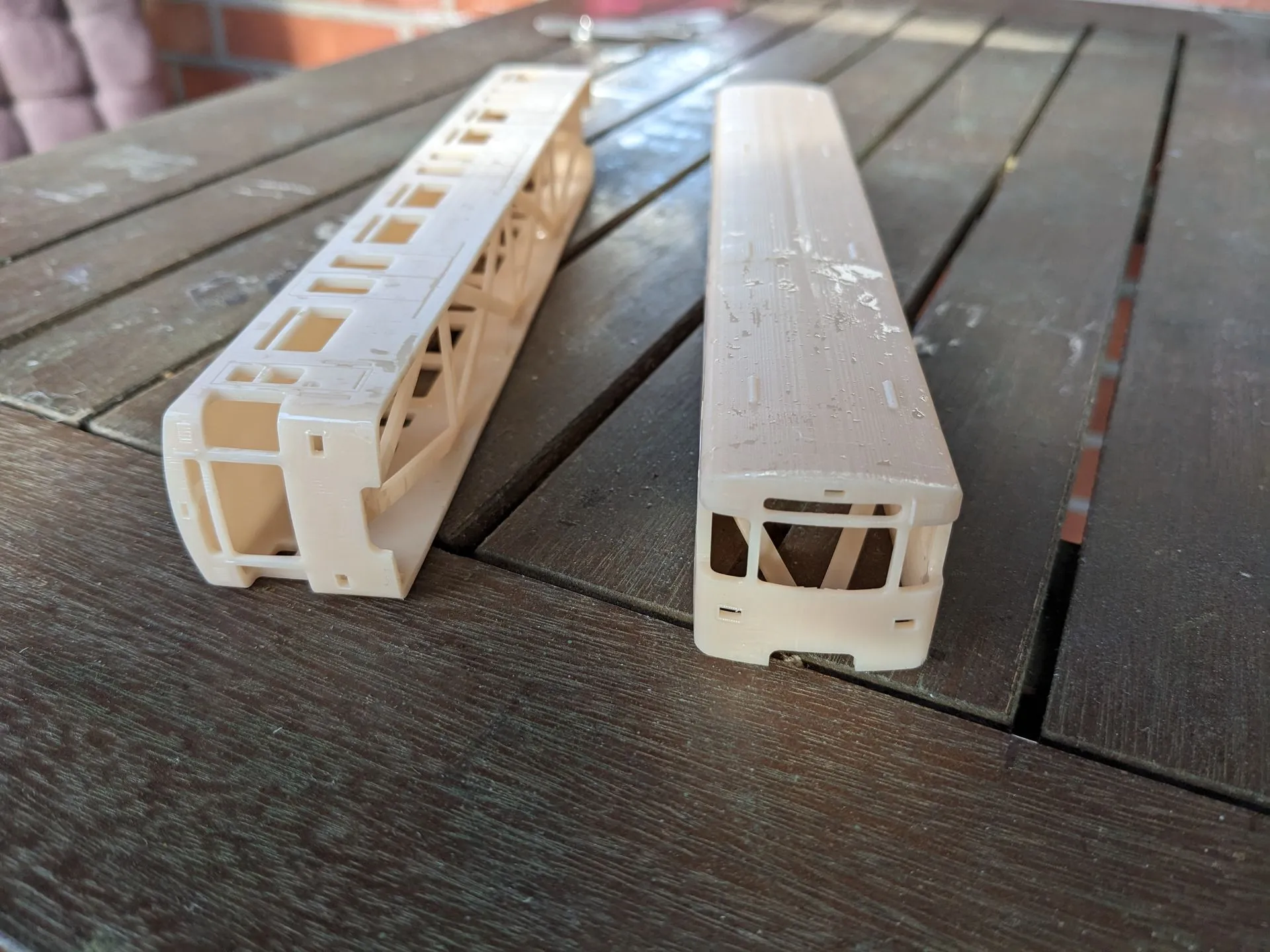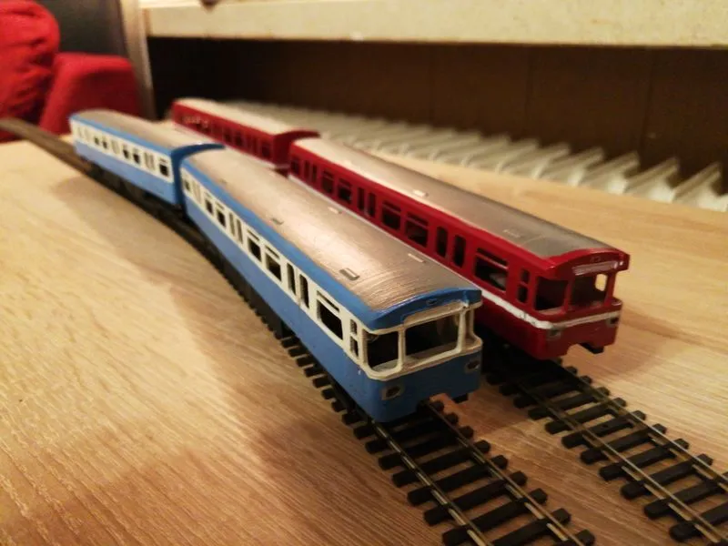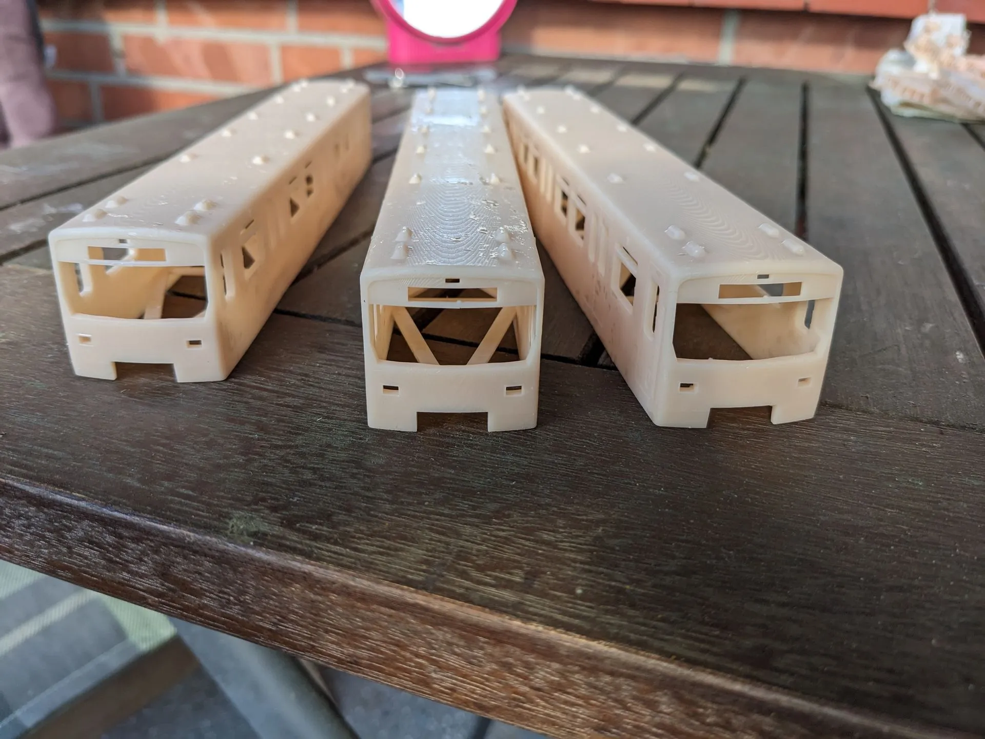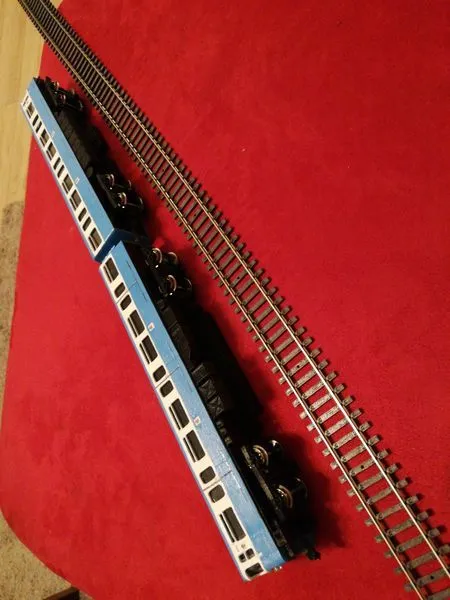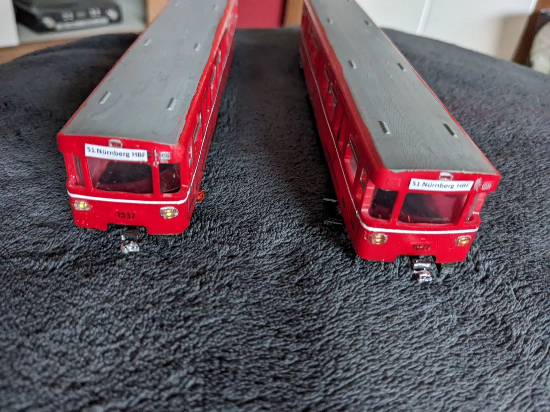 Mit dem 3D-Drucker hergestellt, von handbemalt und beschriftet. Baureihe DT1 oben und unten im Bild.