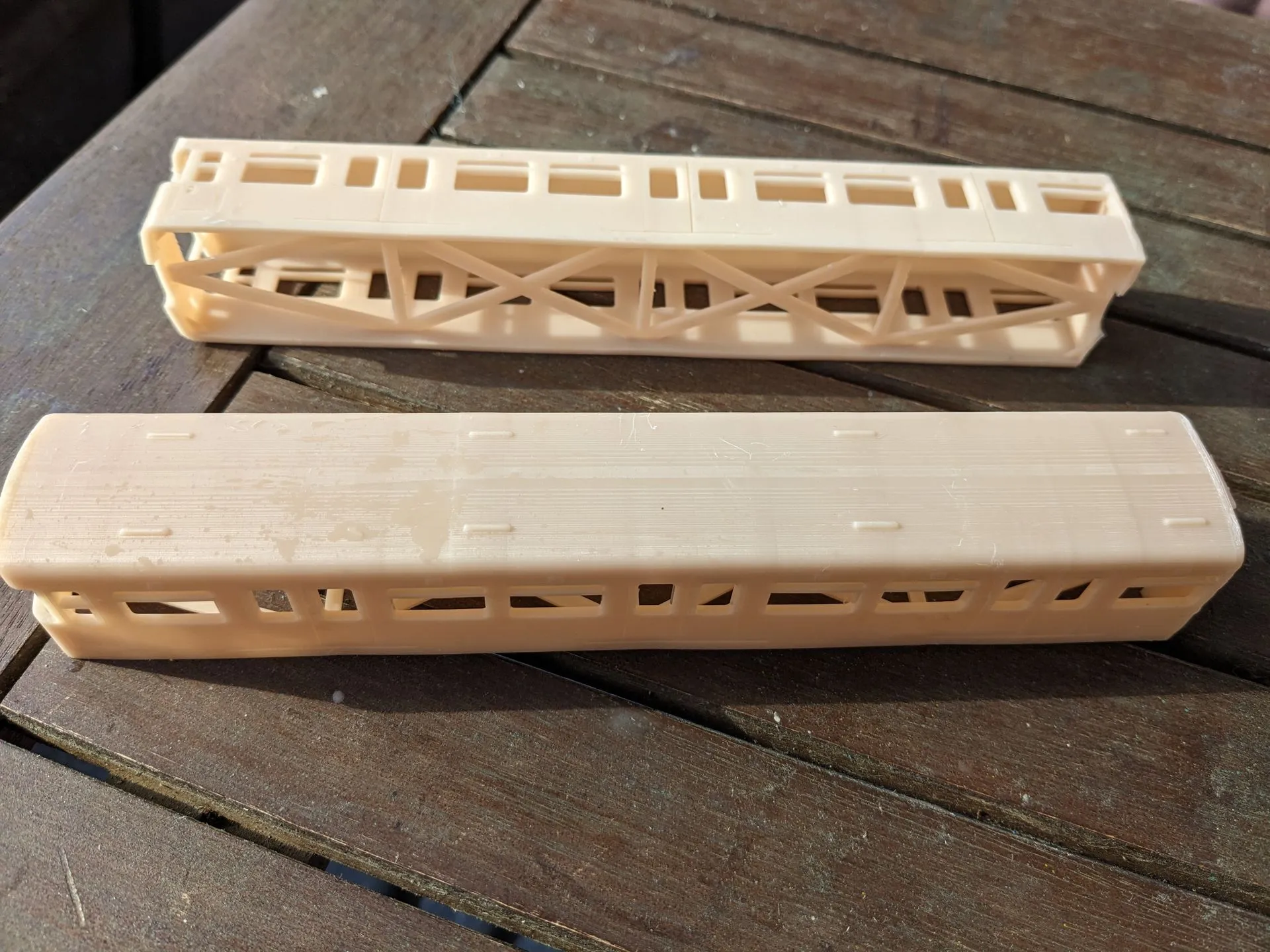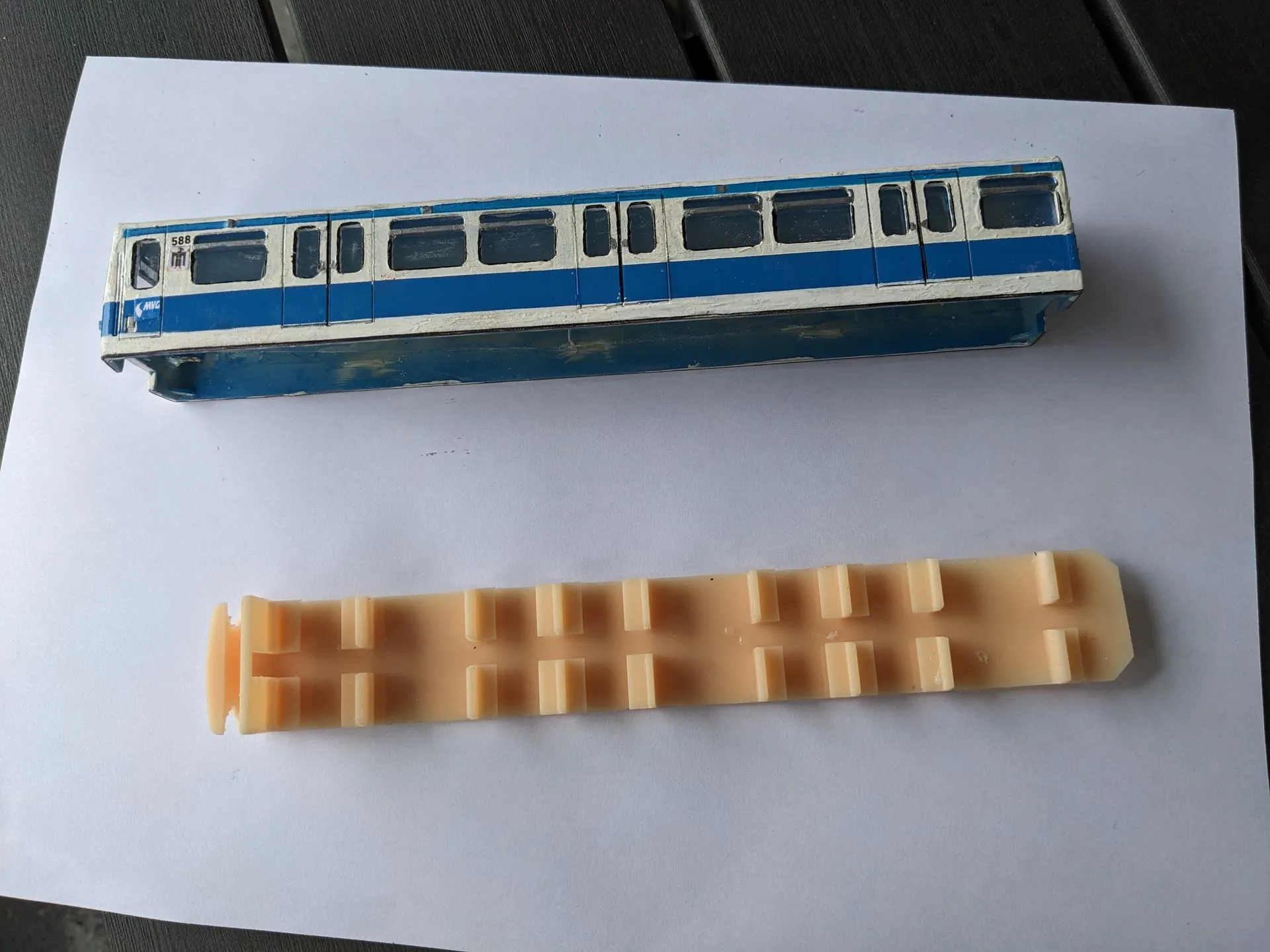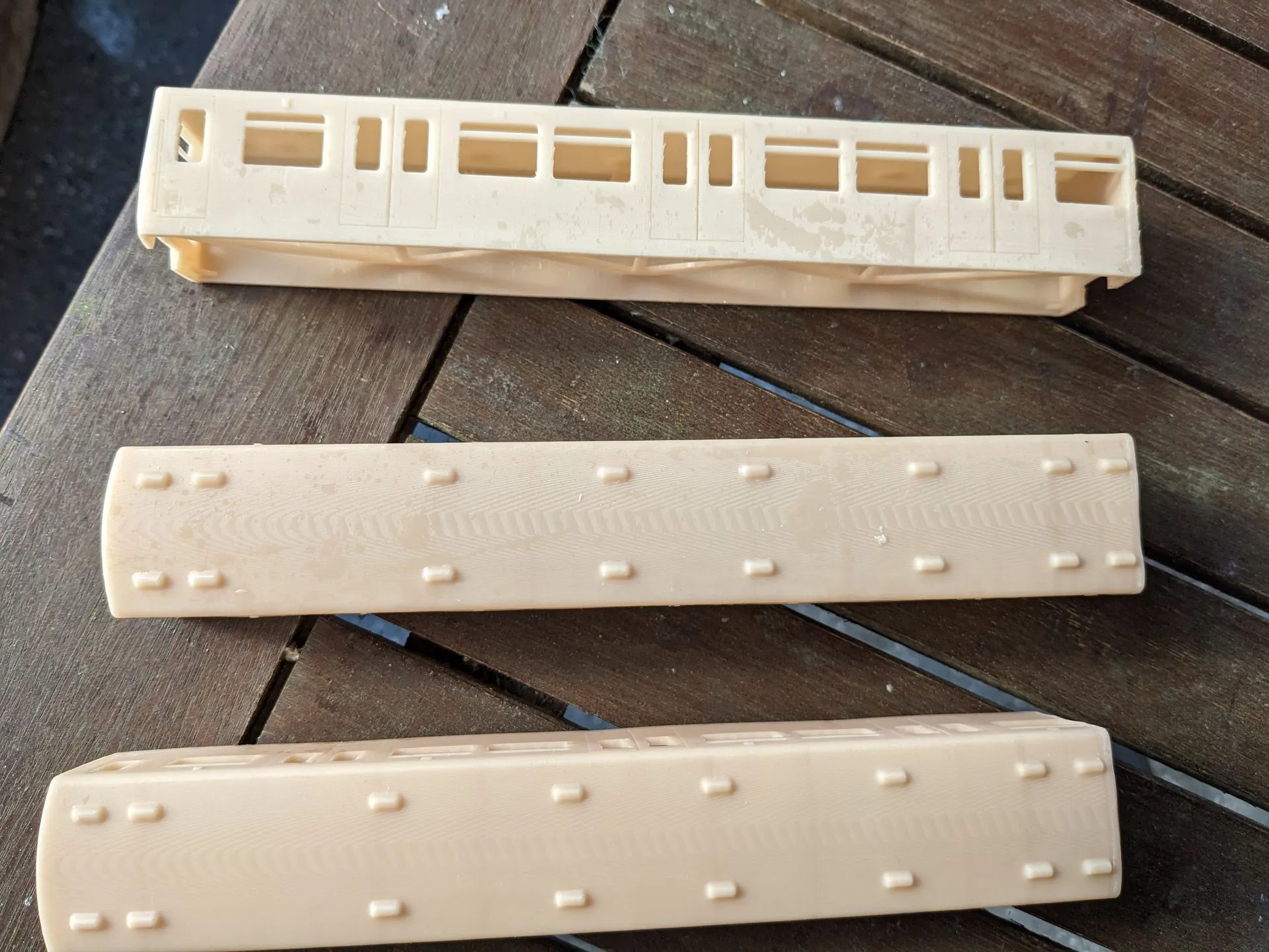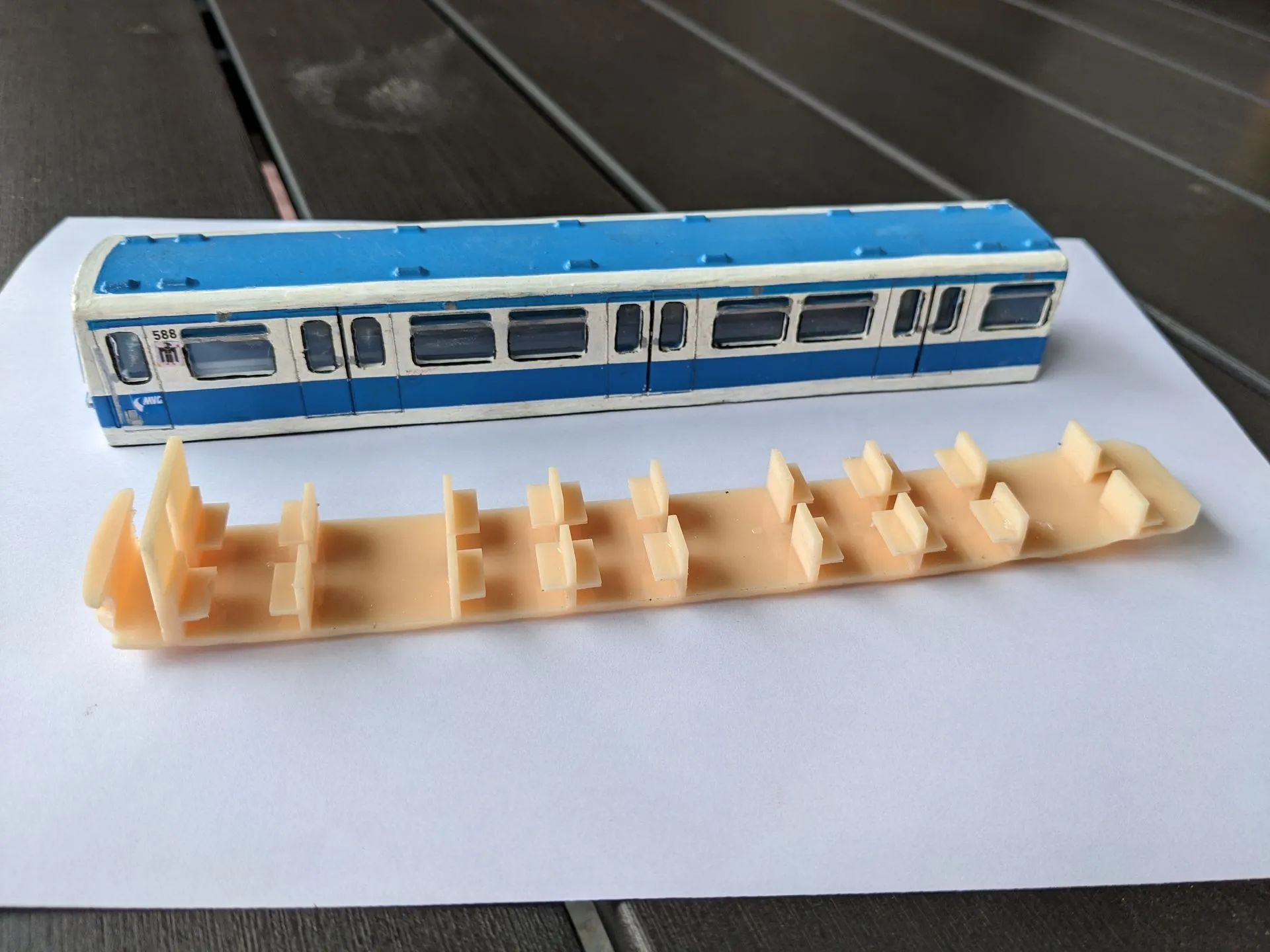 Mit dem 3D-Drucker hergestellt, von handbemalt und beschriftet. Baureihe DT1 oben und unten im Bild.