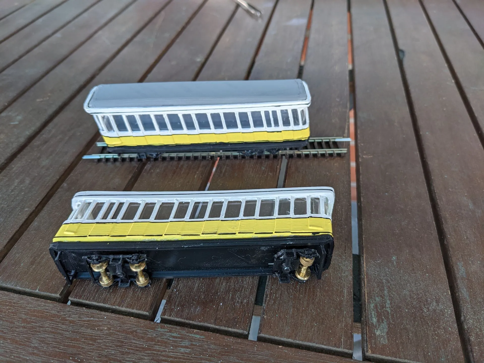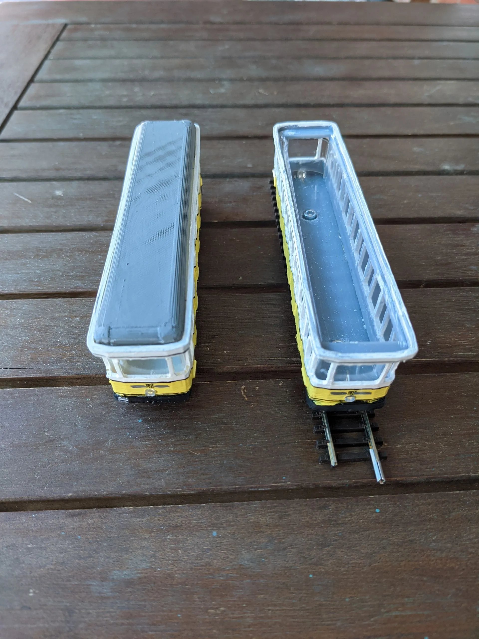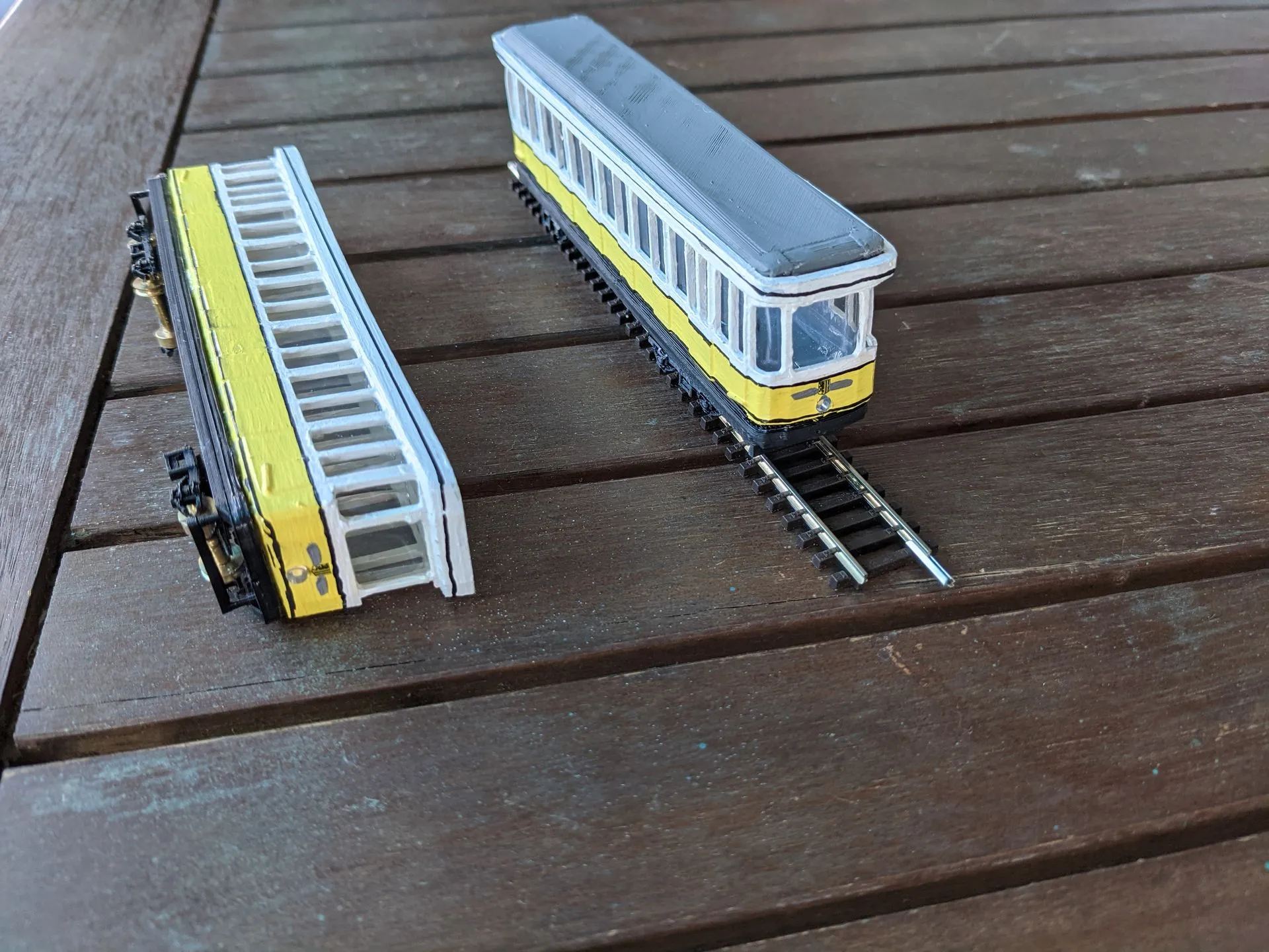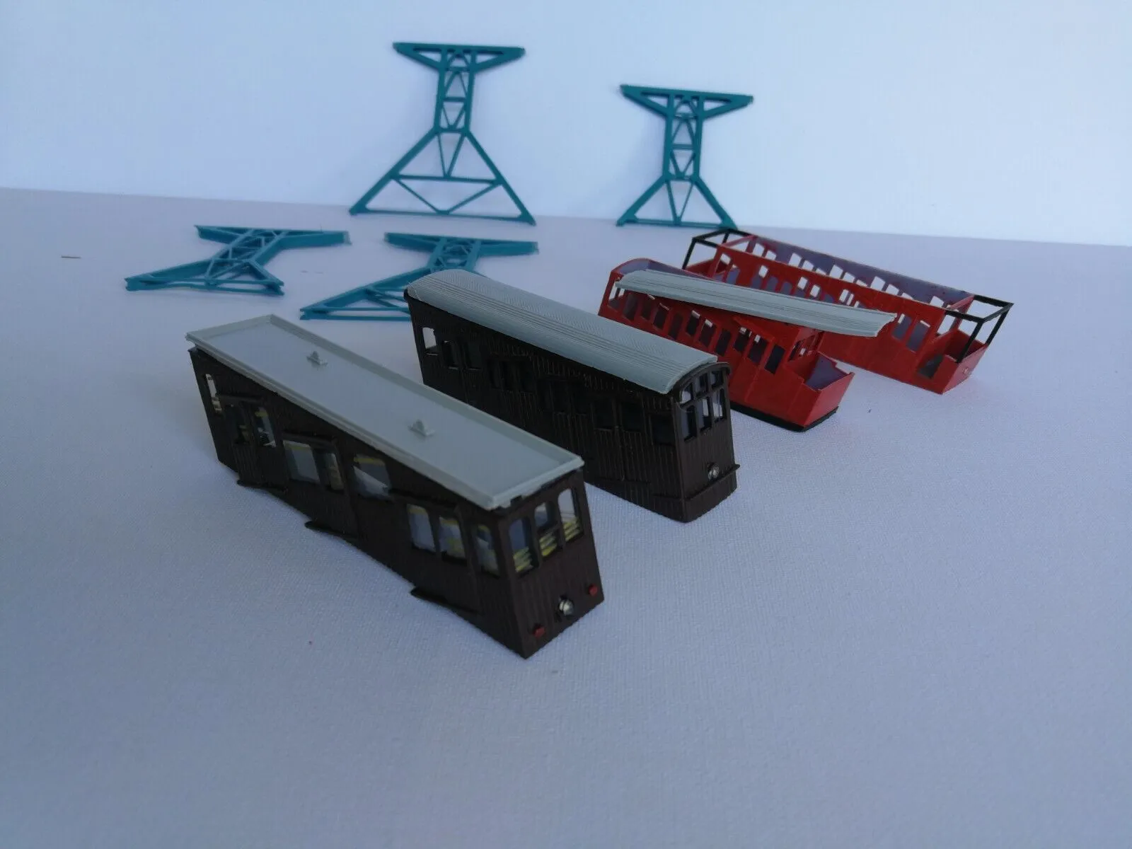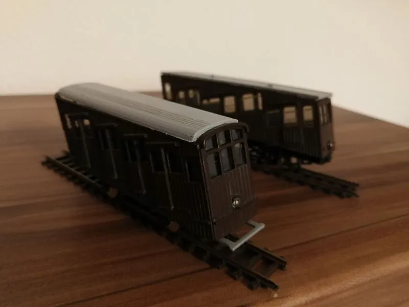 Die Gehäuse sind Serienreif von der Schwebebahn in Dresden und Standseilbahn, die Aufbauten mit einem Messingrad. Die Räder von der Standseilbahn sind ebenfalls aus Messing und steckbar für TT Schienen.