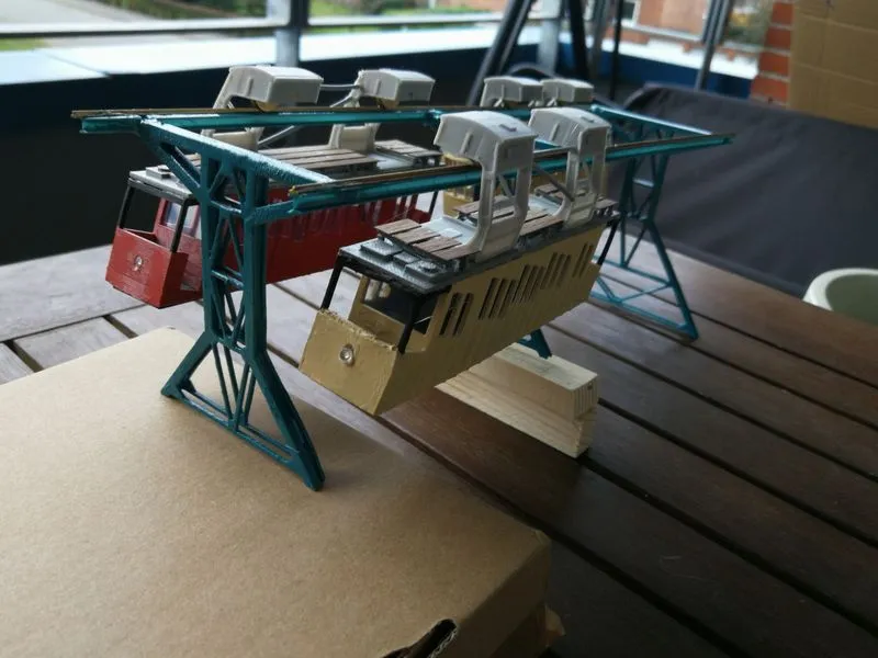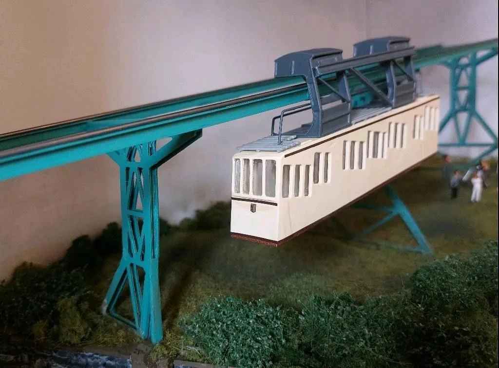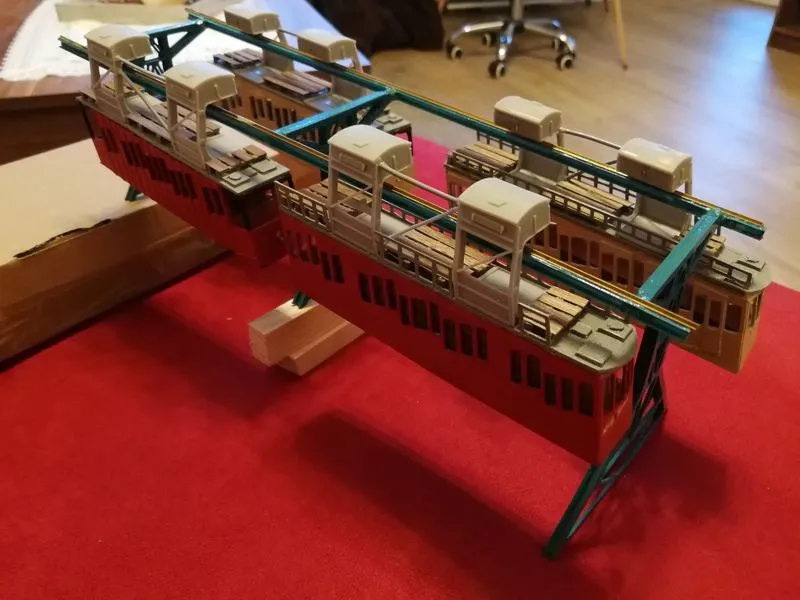 Die Schwebebahn Dresden mit den ersten Wagen, die Gehäuse und Aufbauten sind aus Resindruck hergestellt. Der Boden ist abnehmbar für Beleuchtung.