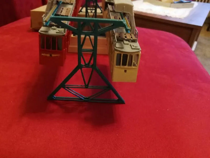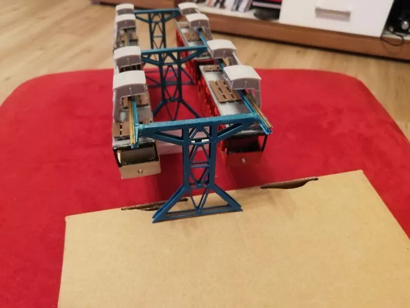 Der Preis liegt bei einem Wagen mit 3 Stützen und Schienen bei 58.- €uro. Jede weitere Stütze 8.- €uro. Inzwischen kann ich die Schwebebahn auch in N fertigen für 49.-€uro mit Schienen.