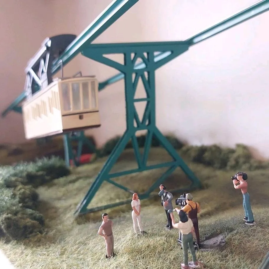 Unten und links ein Modell von einem Kunden der sich ein Diorama gebaut hat von der Schwebebahn Dresden.